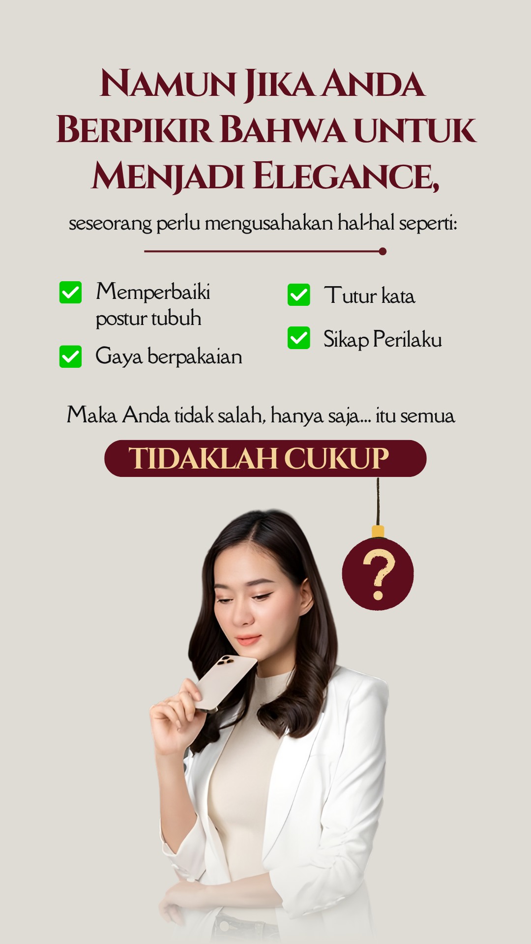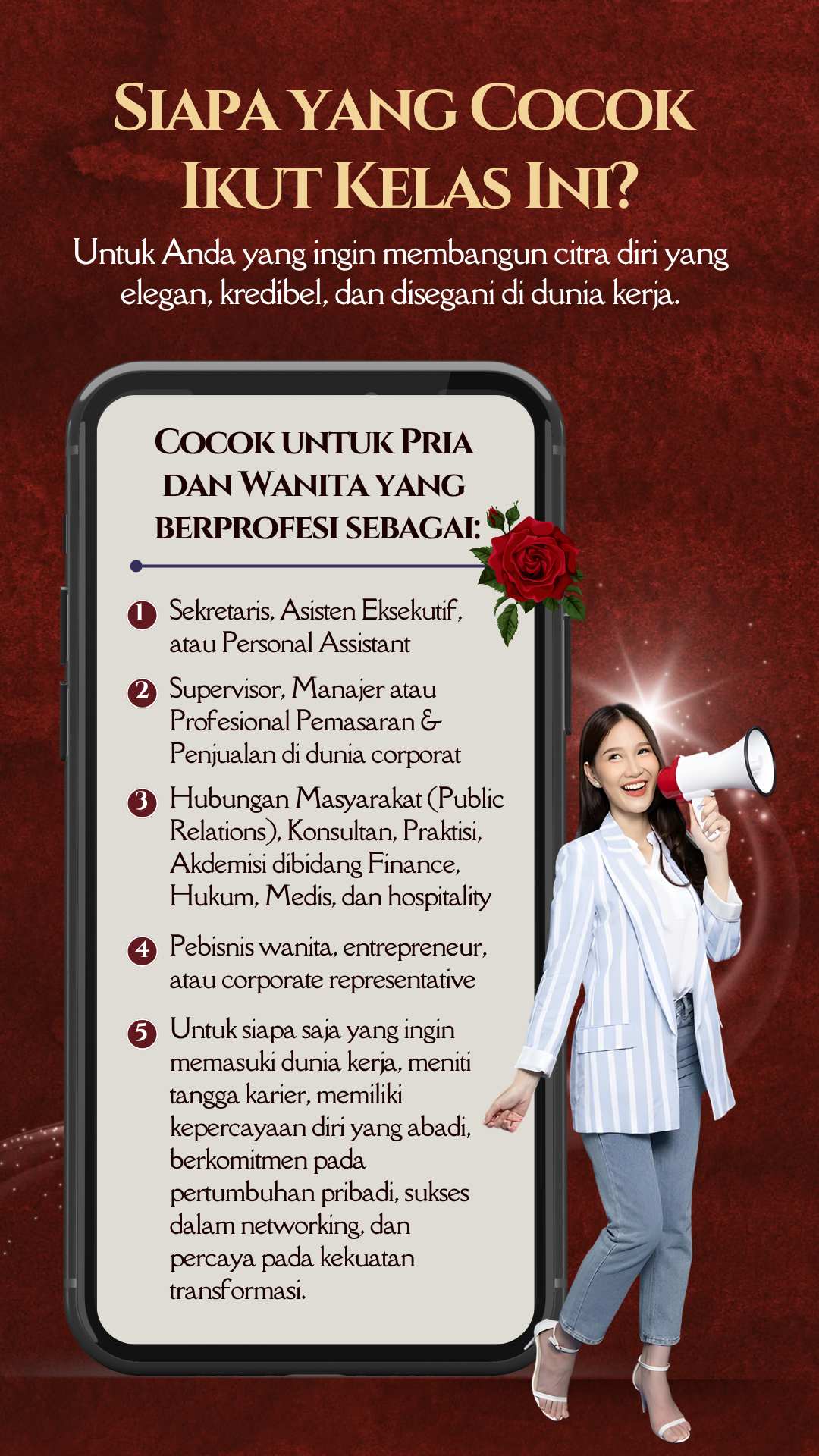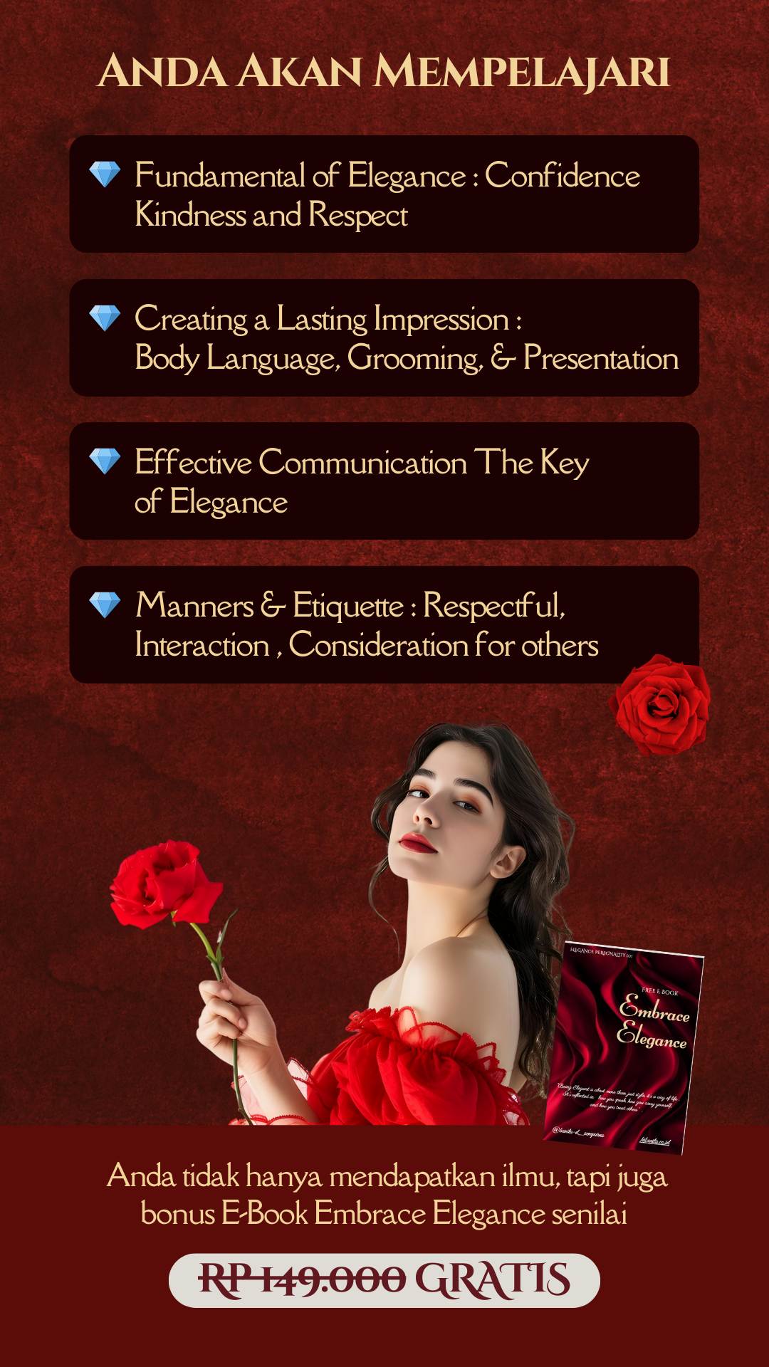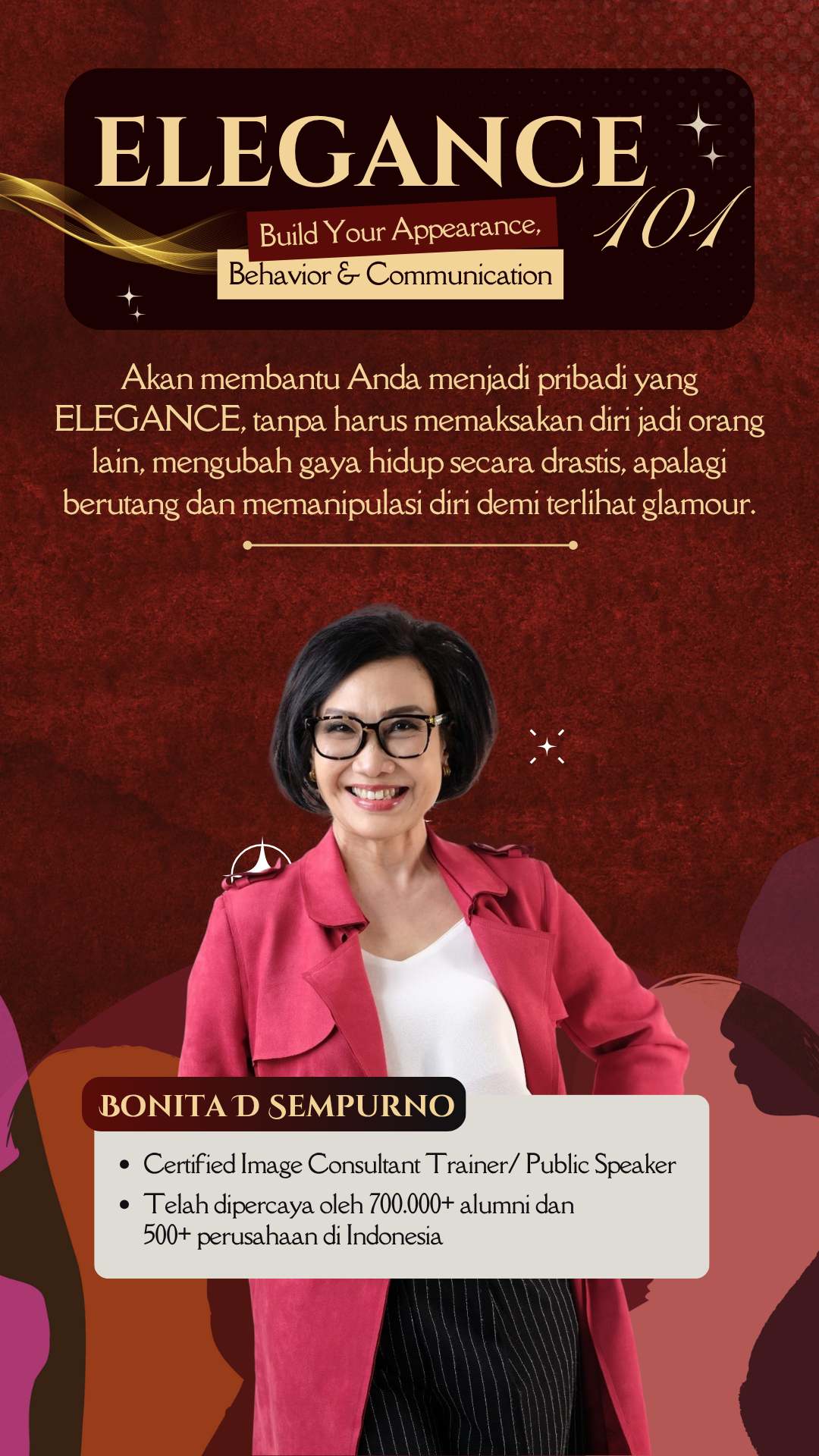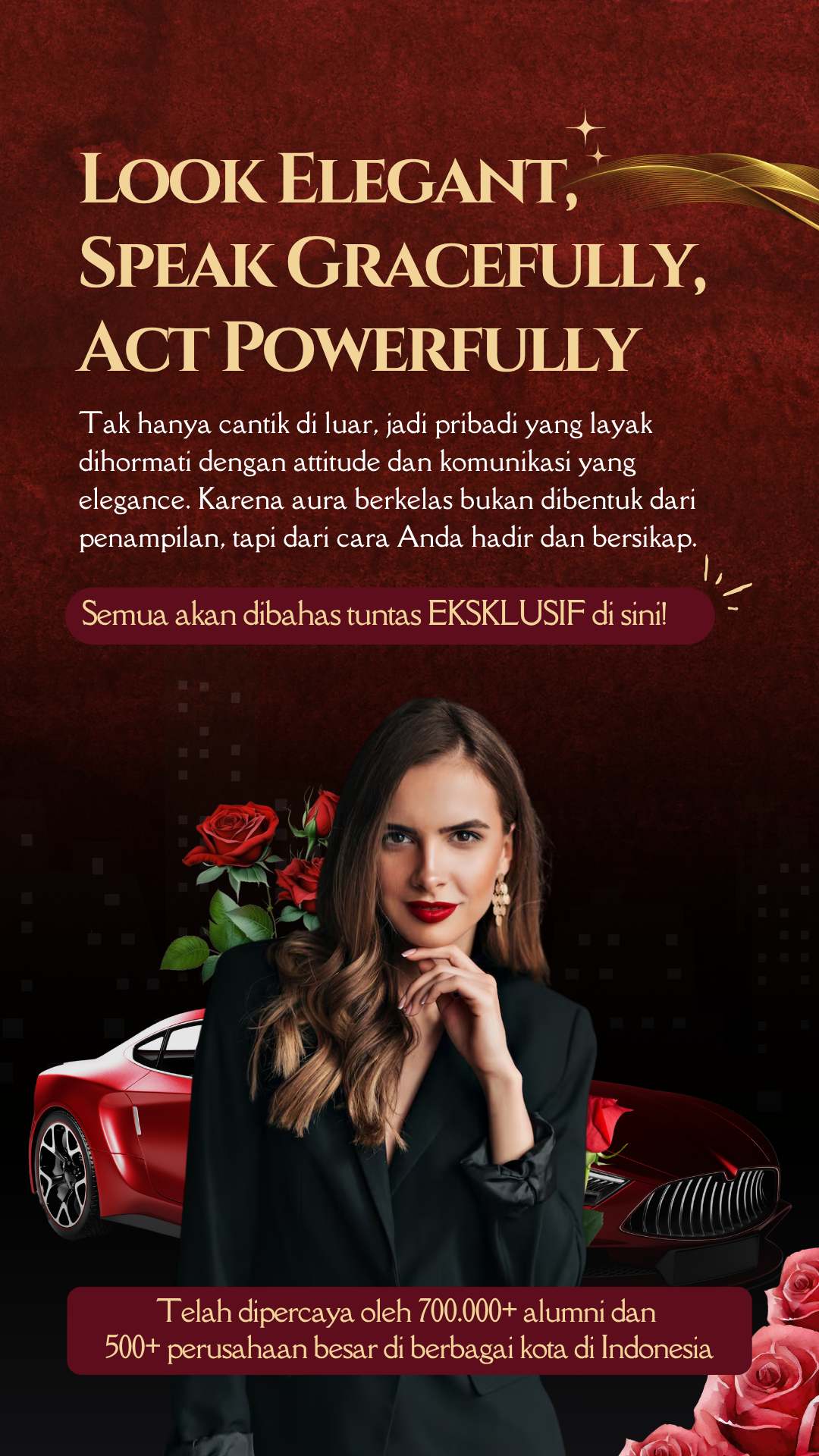 Tak hanya cantik di luar—jadi pribadi yang layak dihormati dengan attitude dan komunikasi yang berkelas. Karena aura berkelas bukan dibentuk dari penampilan, tapi dari cara Anda hadir dan bersikap. Semua akan dibahas tuntas EKSKLUSIF di sini! Telah dipercaya oleh 700.000+ alumni dan 500+ perusahaan besar