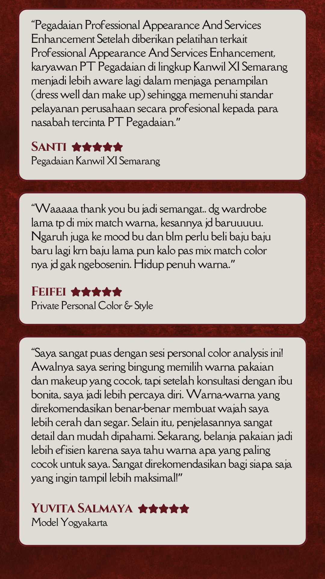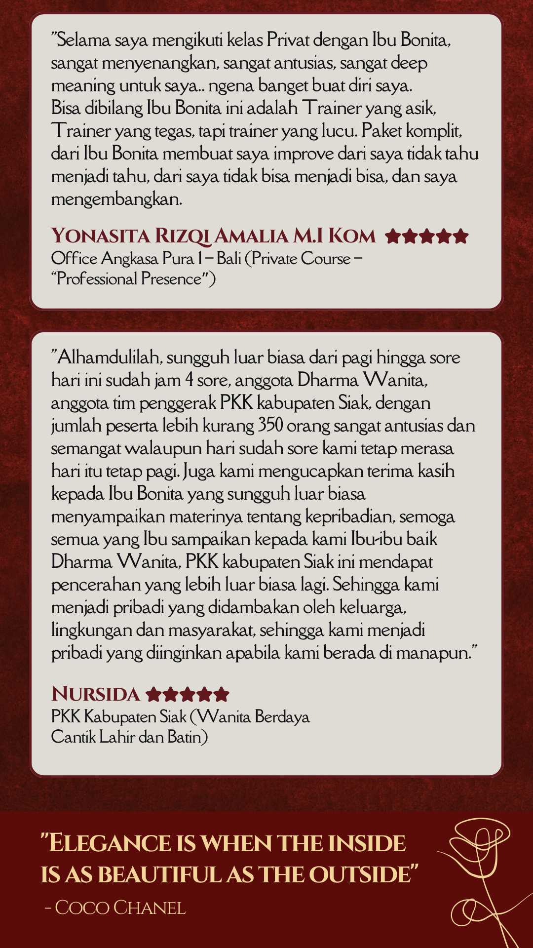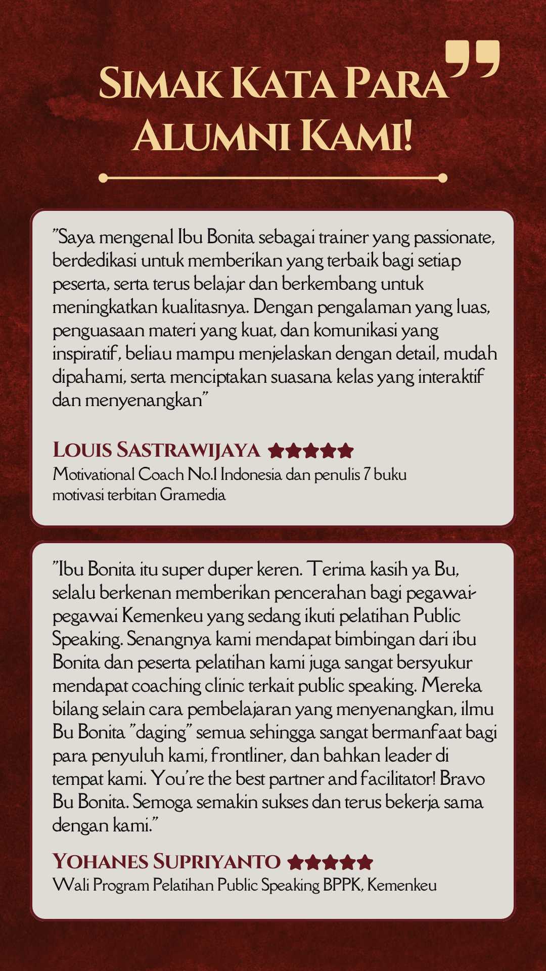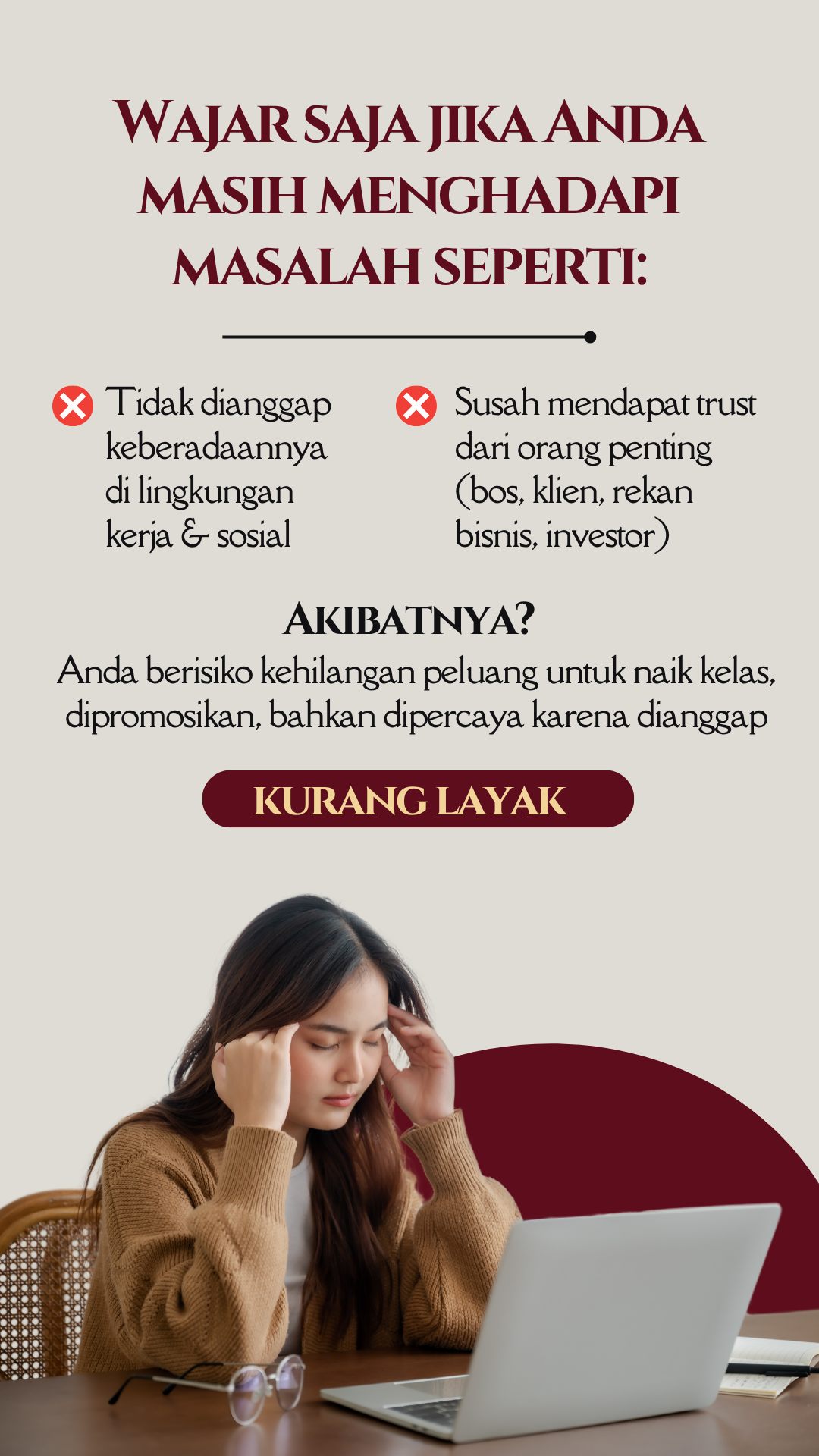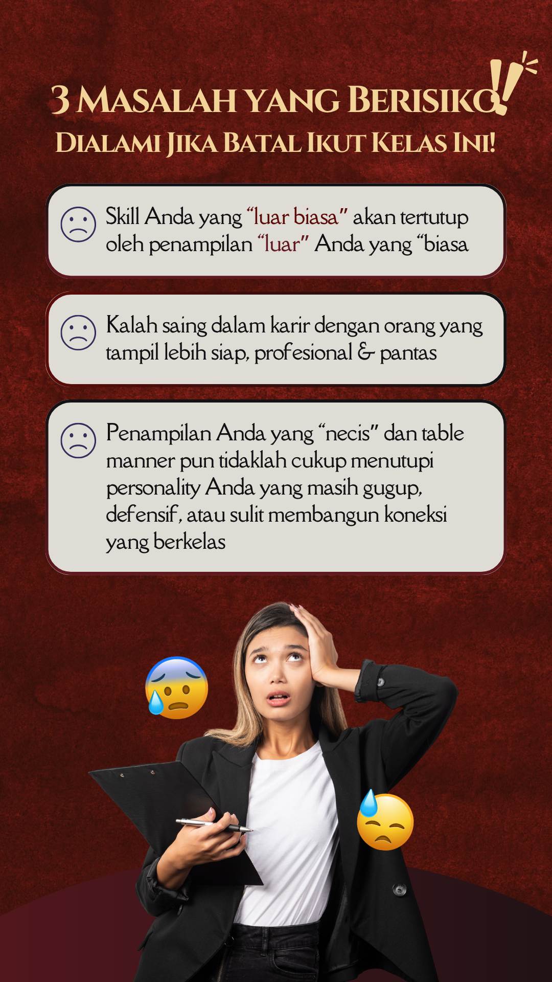 Tak hanya cantik di luar—jadi pribadi yang layak dihormati dengan attitude dan komunikasi yang berkelas. Karena aura berkelas bukan dibentuk dari penampilan, tapi dari cara Anda hadir dan bersikap. Semua akan dibahas tuntas EKSKLUSIF di sini! Telah dipercaya oleh 700.000+ alumni dan 500+ perusahaan besar